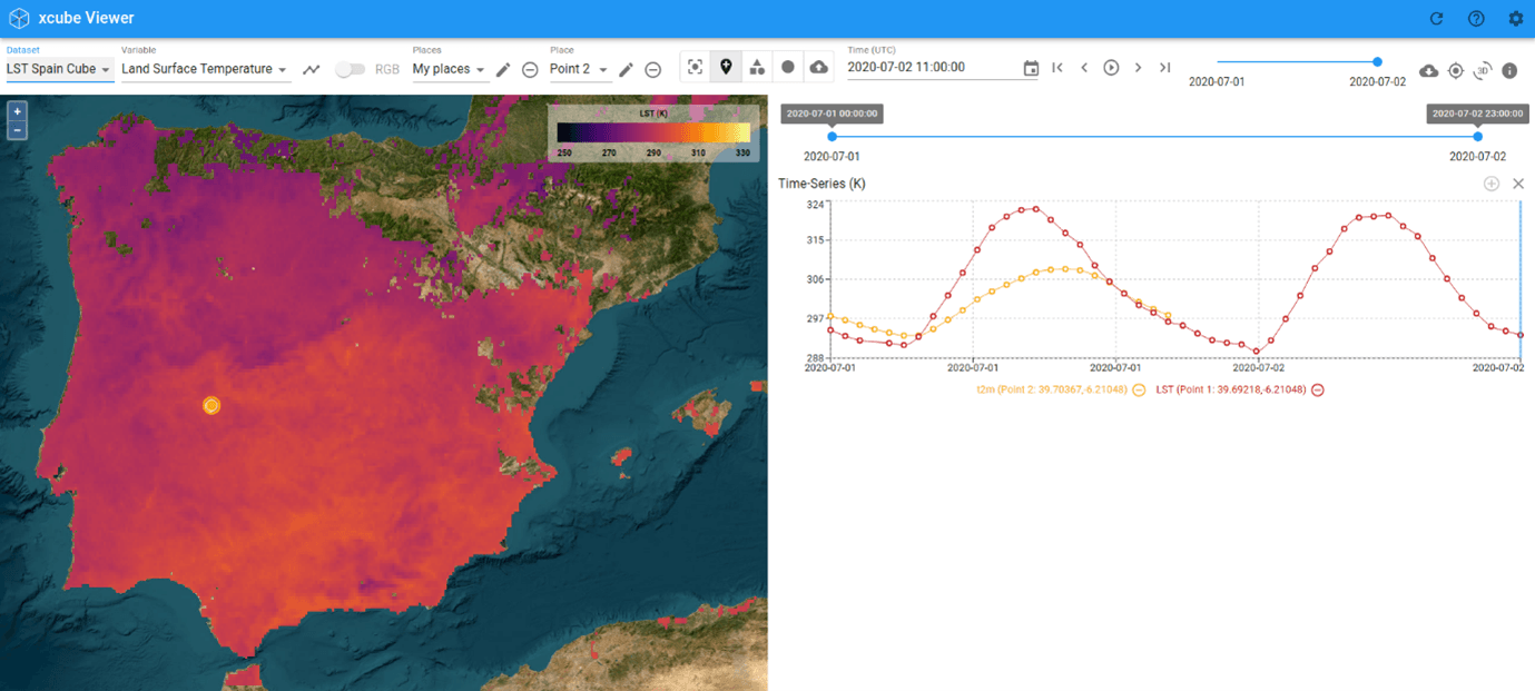 In the example shown in the tutorial, xcube-compatible data cubes are obtained from Copernicus Land Monitoring Service (CLMS) and Copernicus Climate Change Service (C3S) datasets previously downloaded and transformed to xarray using the CilMetLab WEkEO plugin.